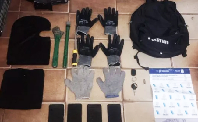 Al detener la marcha del auto, los uniformados comprobaron que el acompañante ya tenía colocados guantes y un pasamontañas. Durante la inspección del rodado, hallaron una mochila con herramientas utilizadas para forzar accesos, entre ellas un cortafierros y un criquet, además de varios pares de guantes, cuellos polares y cuatro celulares.