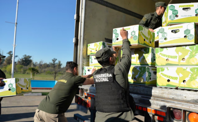 Más tarde, el camión cargado con la fruta fue interceptado en la avenida Jorge Newbery y la Autopista Ezeiza-Cañuelas, cuando se dirigía al Mercado Central. En paralelo, se realizaron allanamientos en Monte Grande y Ezeiza. Allí se secuestraron un GPS, celulares, dos autos y documentación.