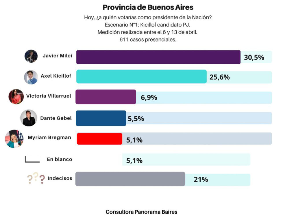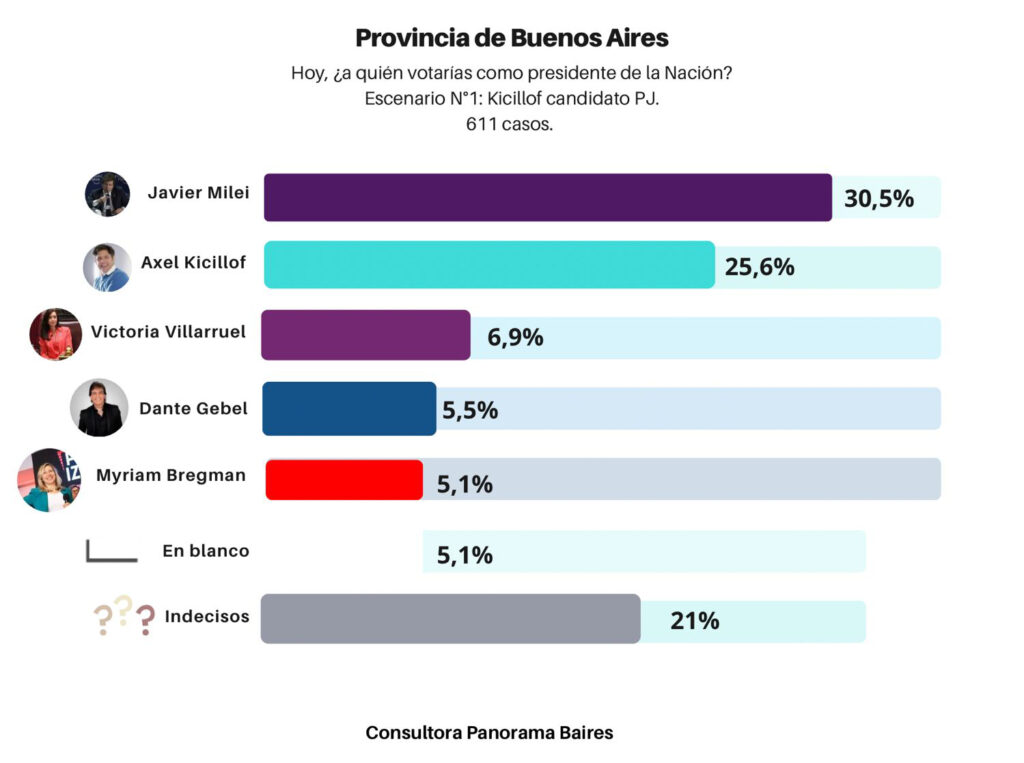 Javier Milei primero. Pero en baja, apenas perfora el 30%. Axel Kicillof, en tanto, el mejor posicionado del peronismo, a 5 puntos.