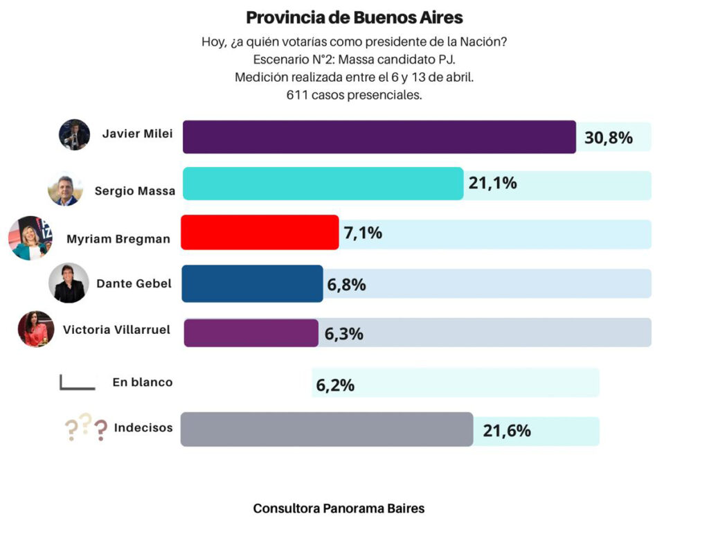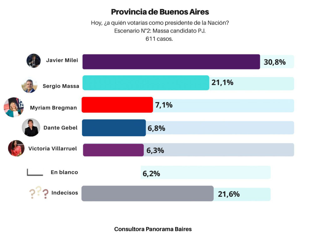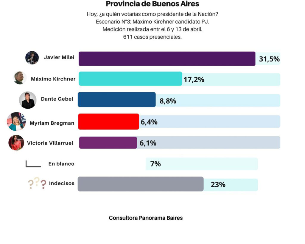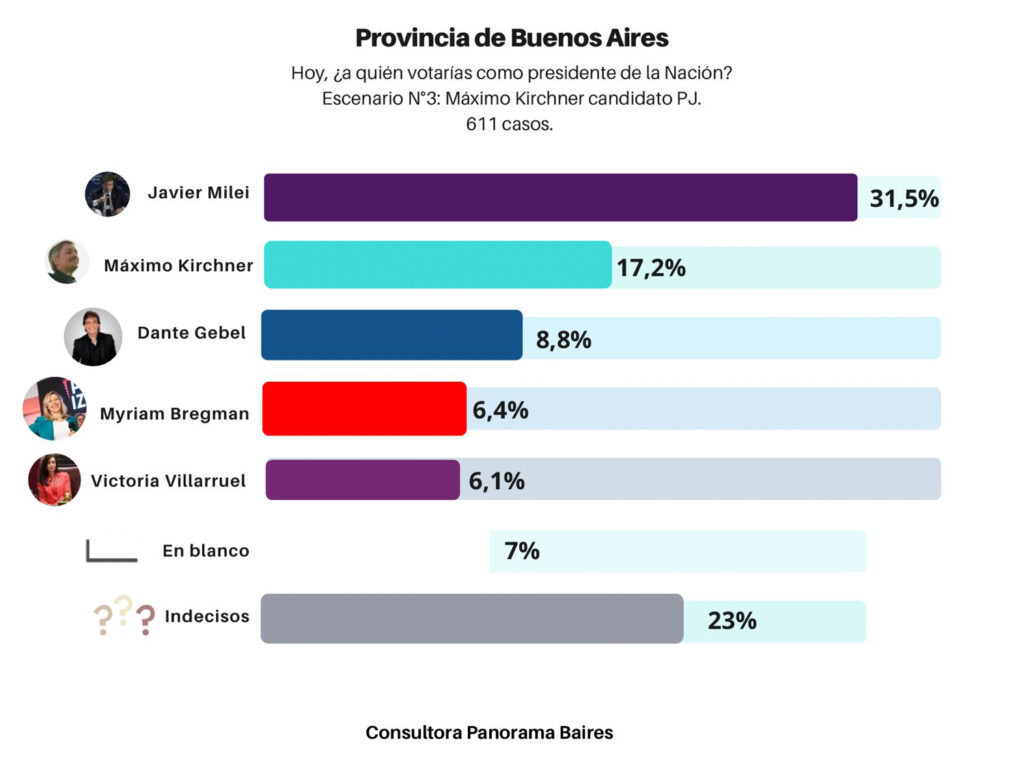 Victoria Villarruel mantiene el porcentaje de sondeo anterior 6%. Los indecisos están en un promedio de 22% entre los 3 escenarios y el voto en blanco en 6%.